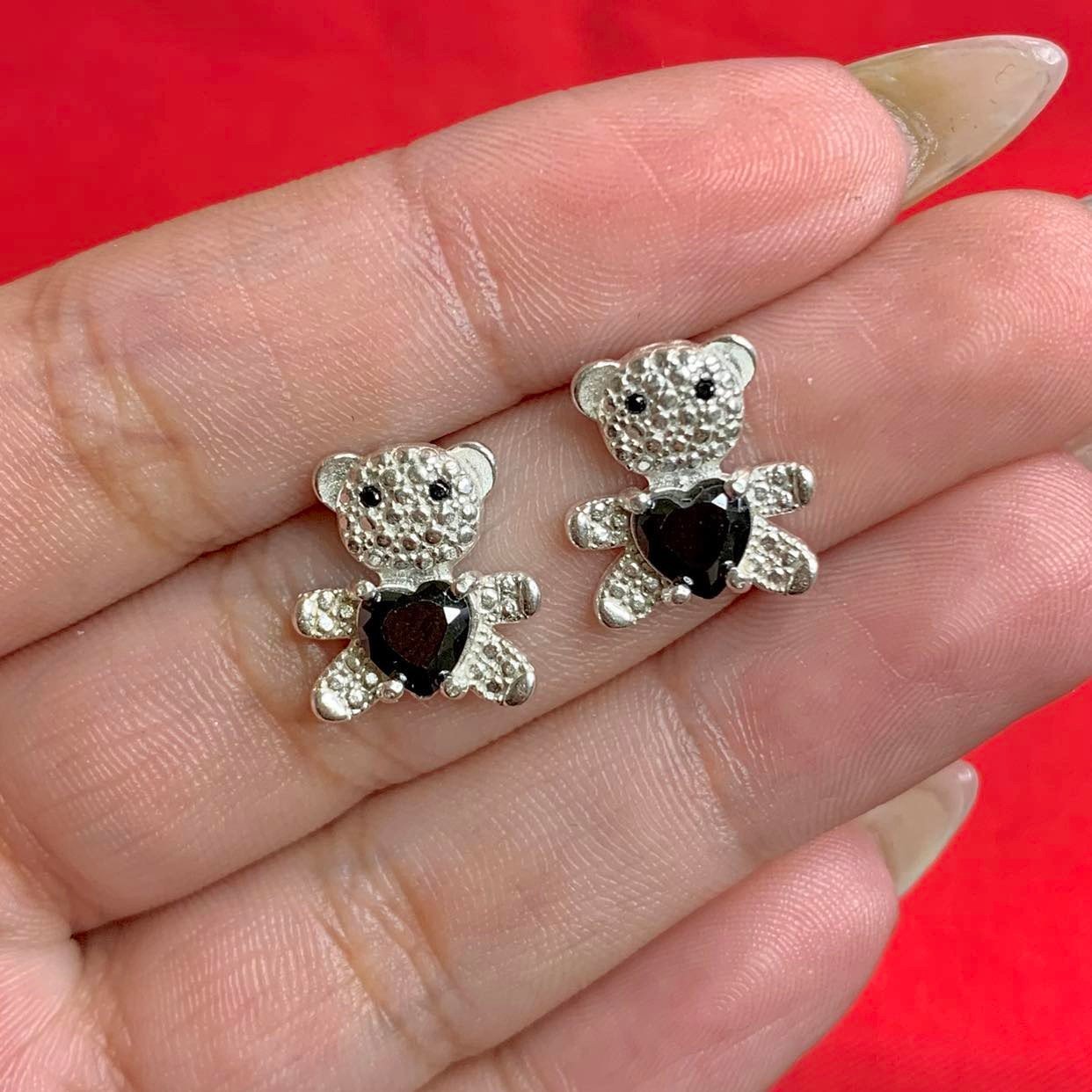 Aros Osito con Piedra NEGRA de Plata 925
