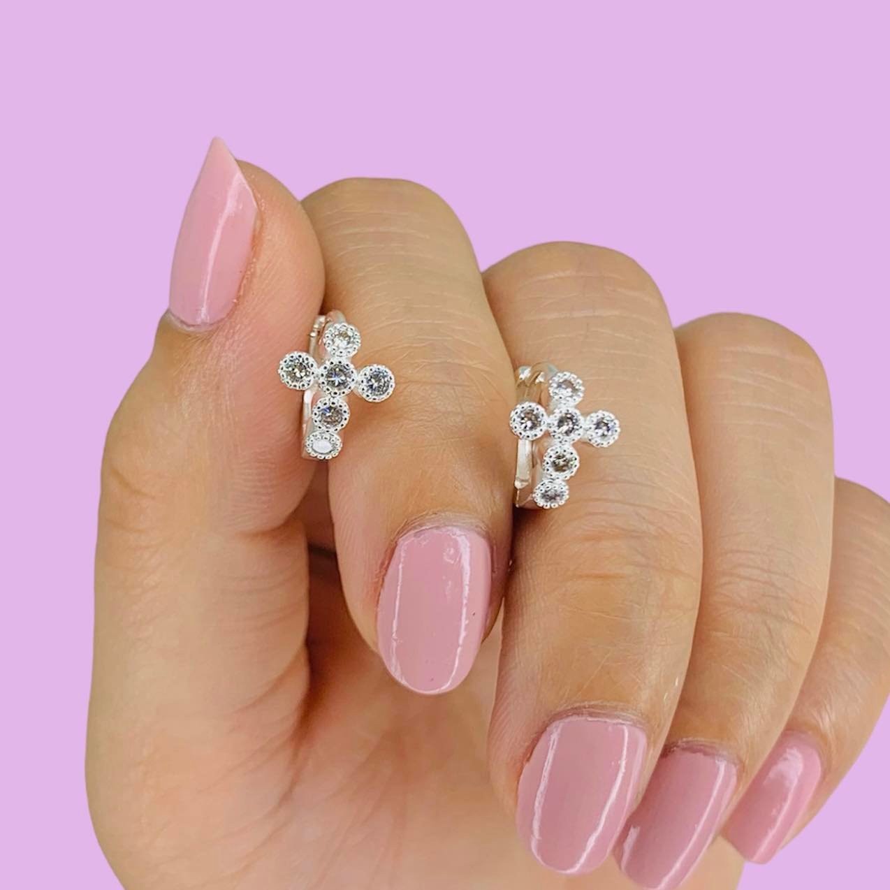 Aros Huggies Cruz de Rio con piedras blancas Laminado de Plata 925