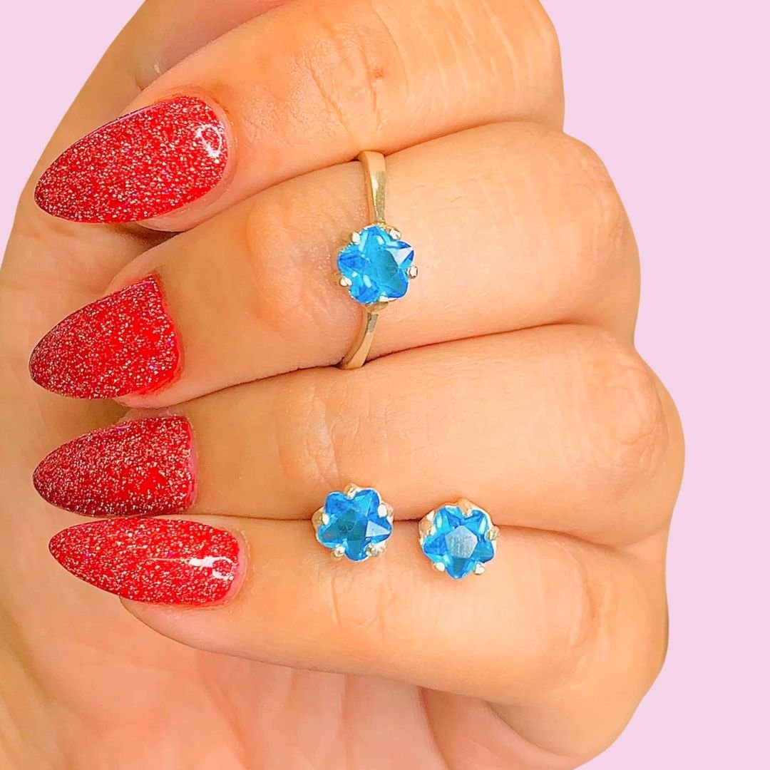 Conjunto Anillo con Aros Flor Agua Marina de Plata 925