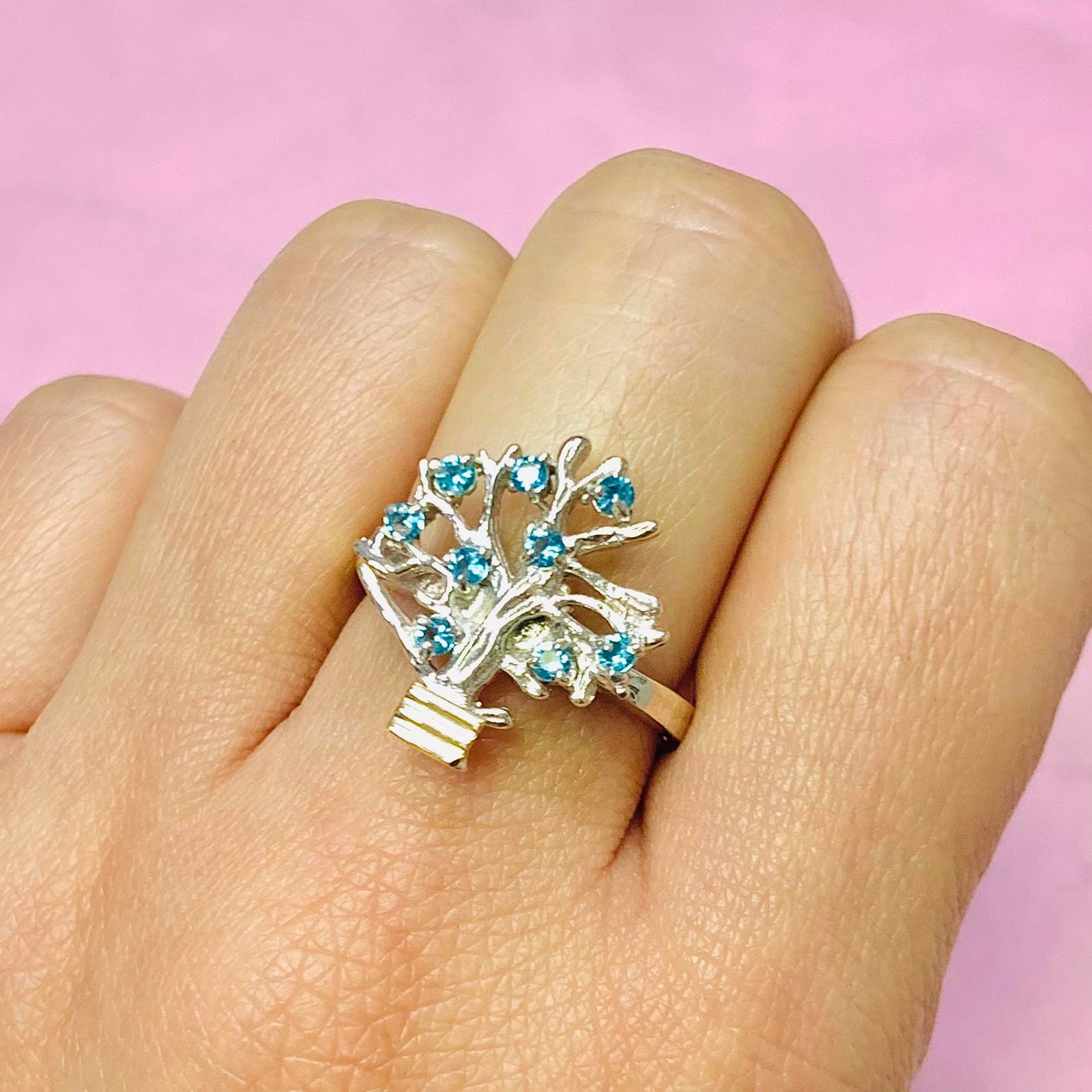 Anillo Arbol de La Vida Agua Marina de Plata y Oro