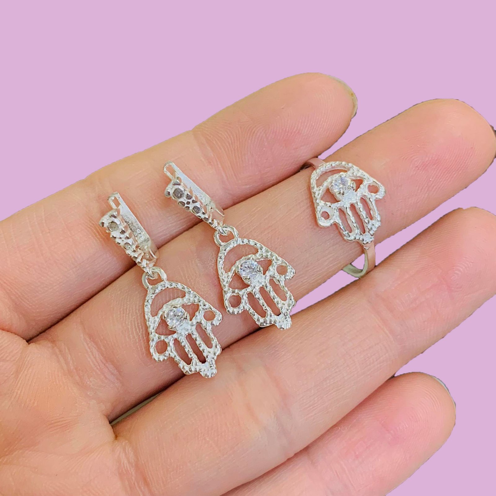 Artículo: KIT 036-2Conjunto Aros Anillo Dije Mano de FatimaMaterial: Plata 925