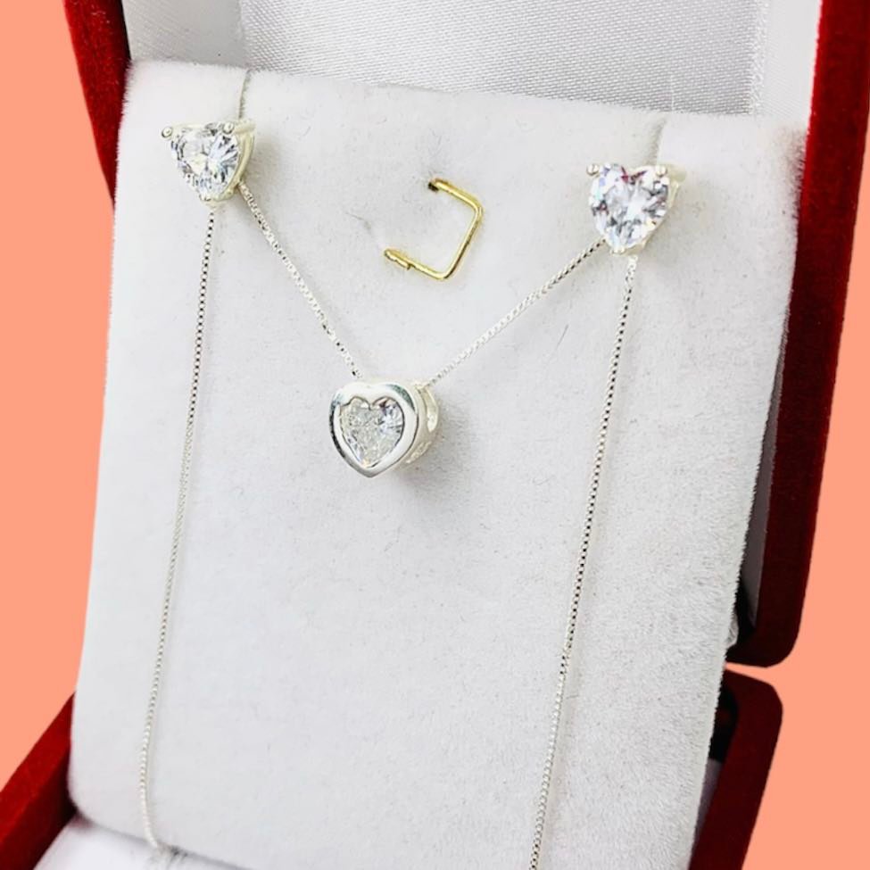 Conjunto Cadena Veneziana y aros Corazon con Piedra Blanca Plata 925