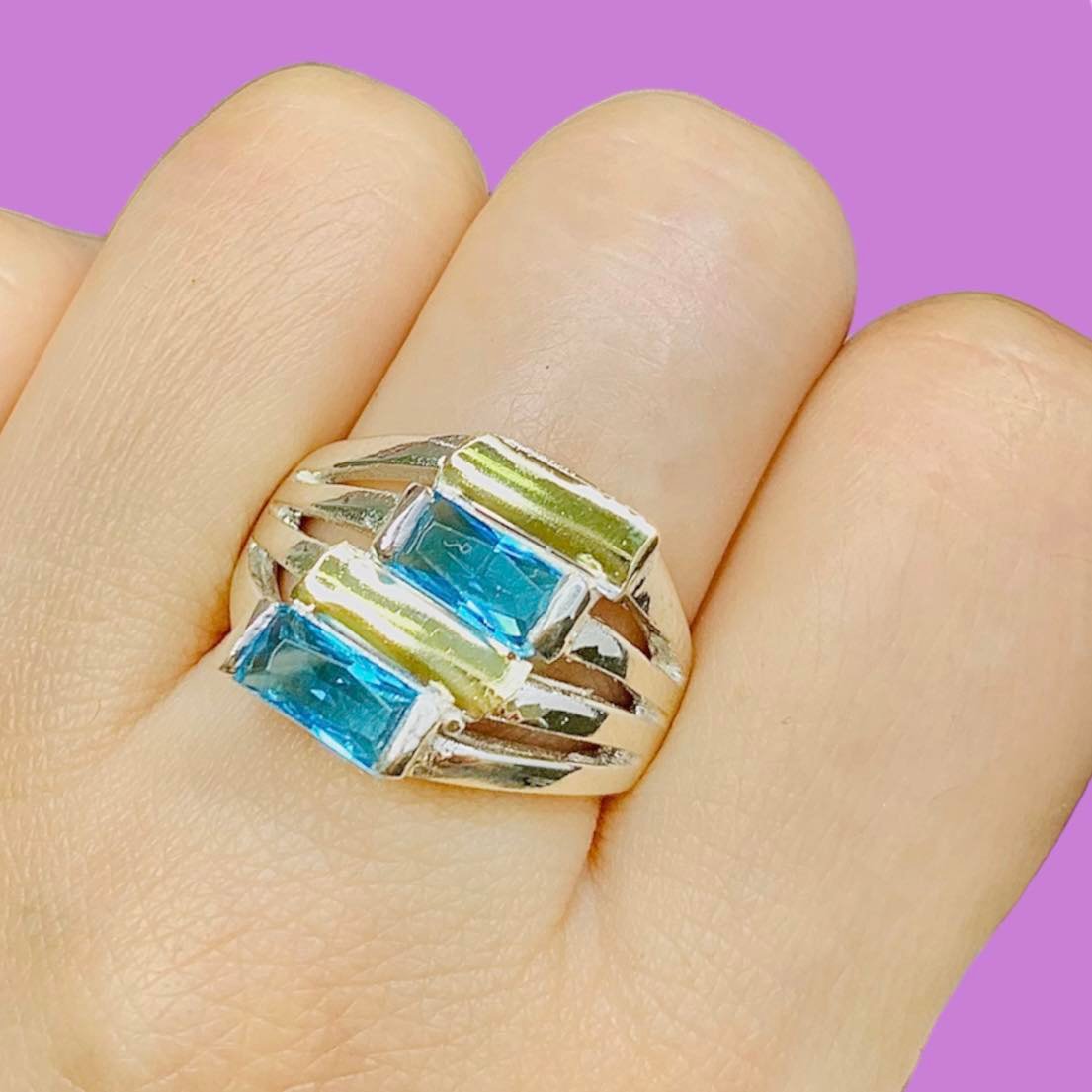 Anillo Greta con Piedra Rectangular Celeste de Plata y Oro