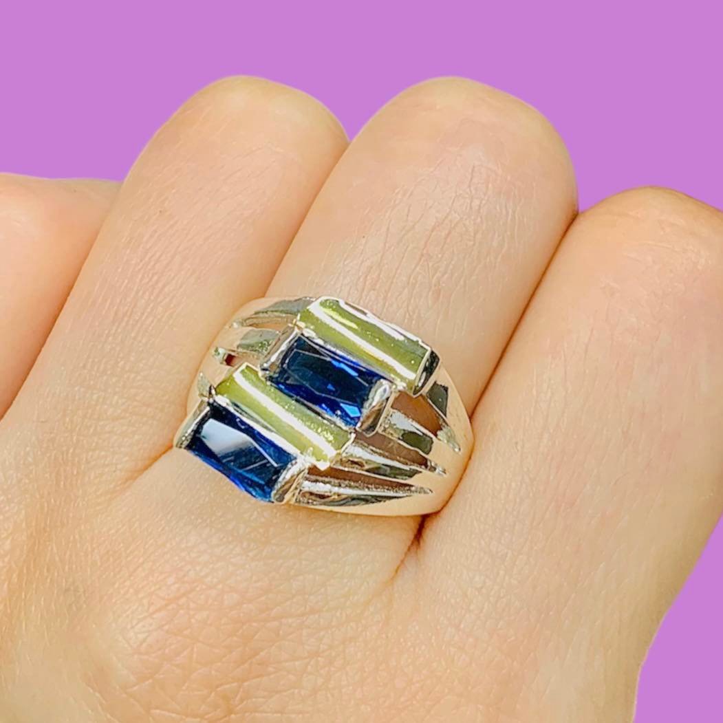 Anillo Greta con Piedra Rectangular Azul de Plata y Oro