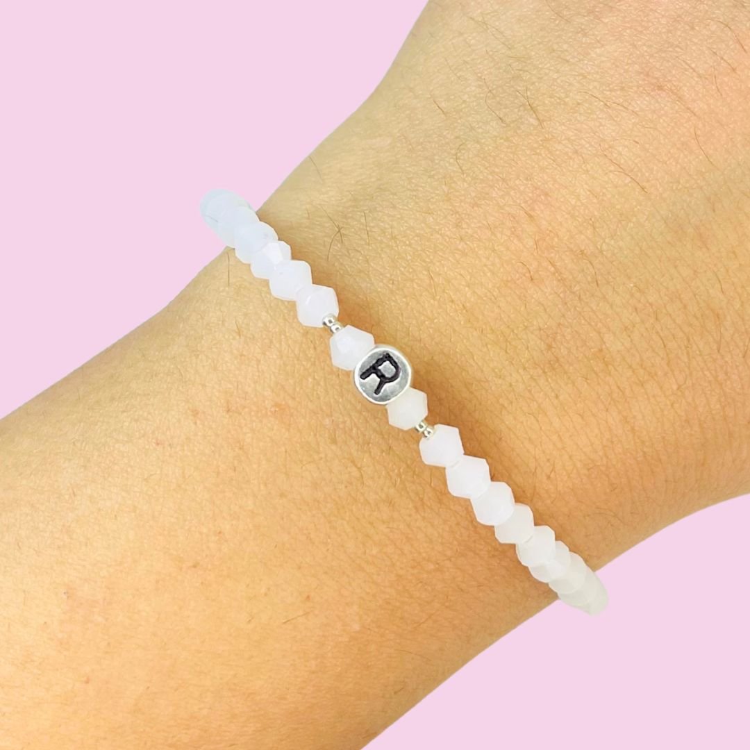 Pulsera Cristal Blanco con Dije Pasante Inicial R Plata 925