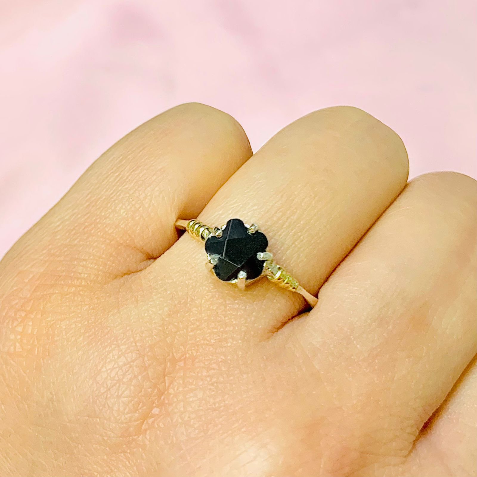 Anillo Flor Primavera con cubic Negro de Plata y Oro