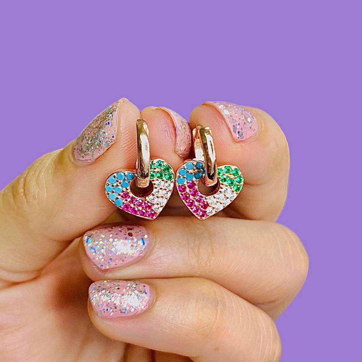 Aros Clip Italiano Corazon piedras multicolor Baño de Oro Rose