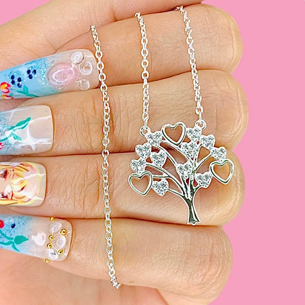 Artículo: kit 054Conjunto rolito espejado con dije arbol de corazones con piedras blancas micropave