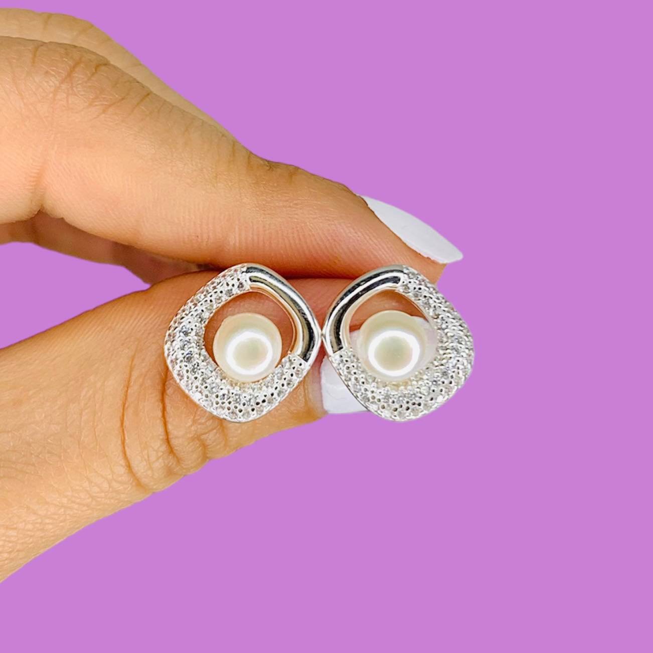 Aros Perla con cuadrado y piedras blancas de Plata 925