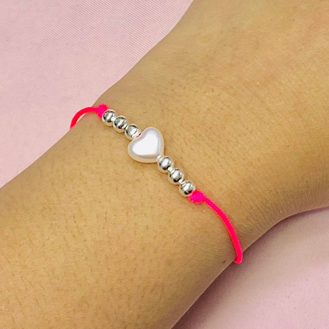 Pulsera Hilo Fucsia con corazon perla y bolitas