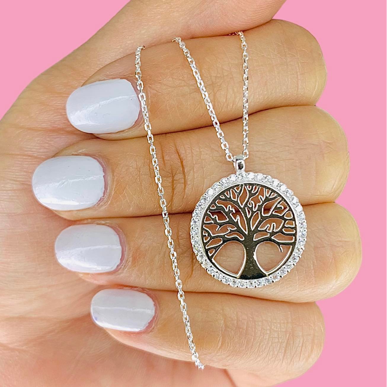 Conjunto rolito espejado dije arbol de la vida con piedras blancas de Plata 925