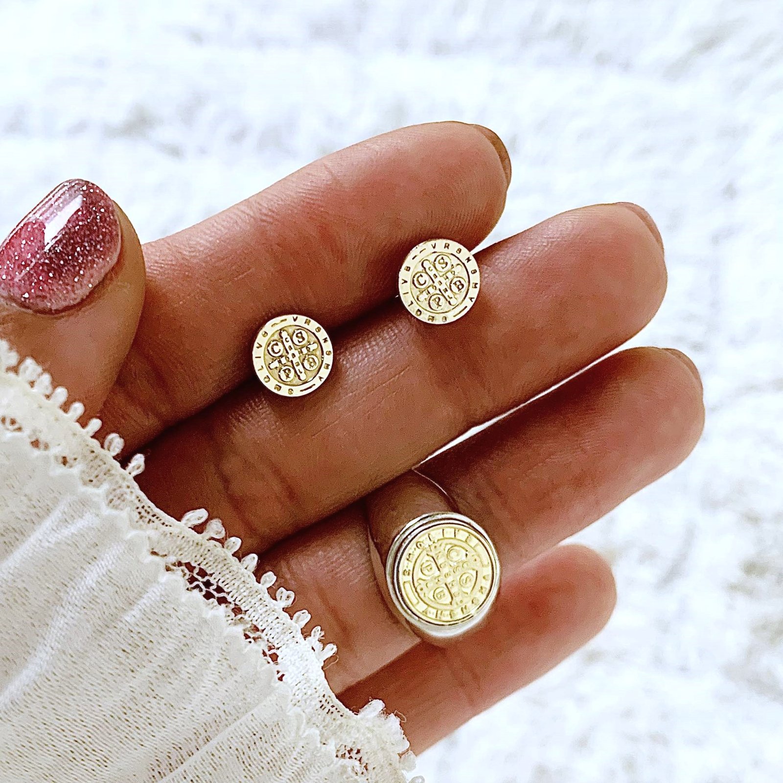 Conjunto Aros y Anillo Sello San Benito de Plata y Oro