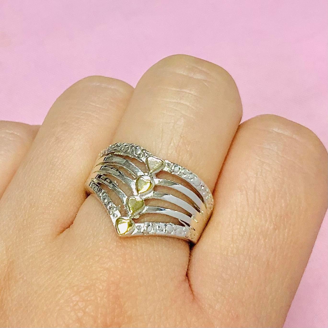 Anillo ancho forma de V con corazones Plata y Oro