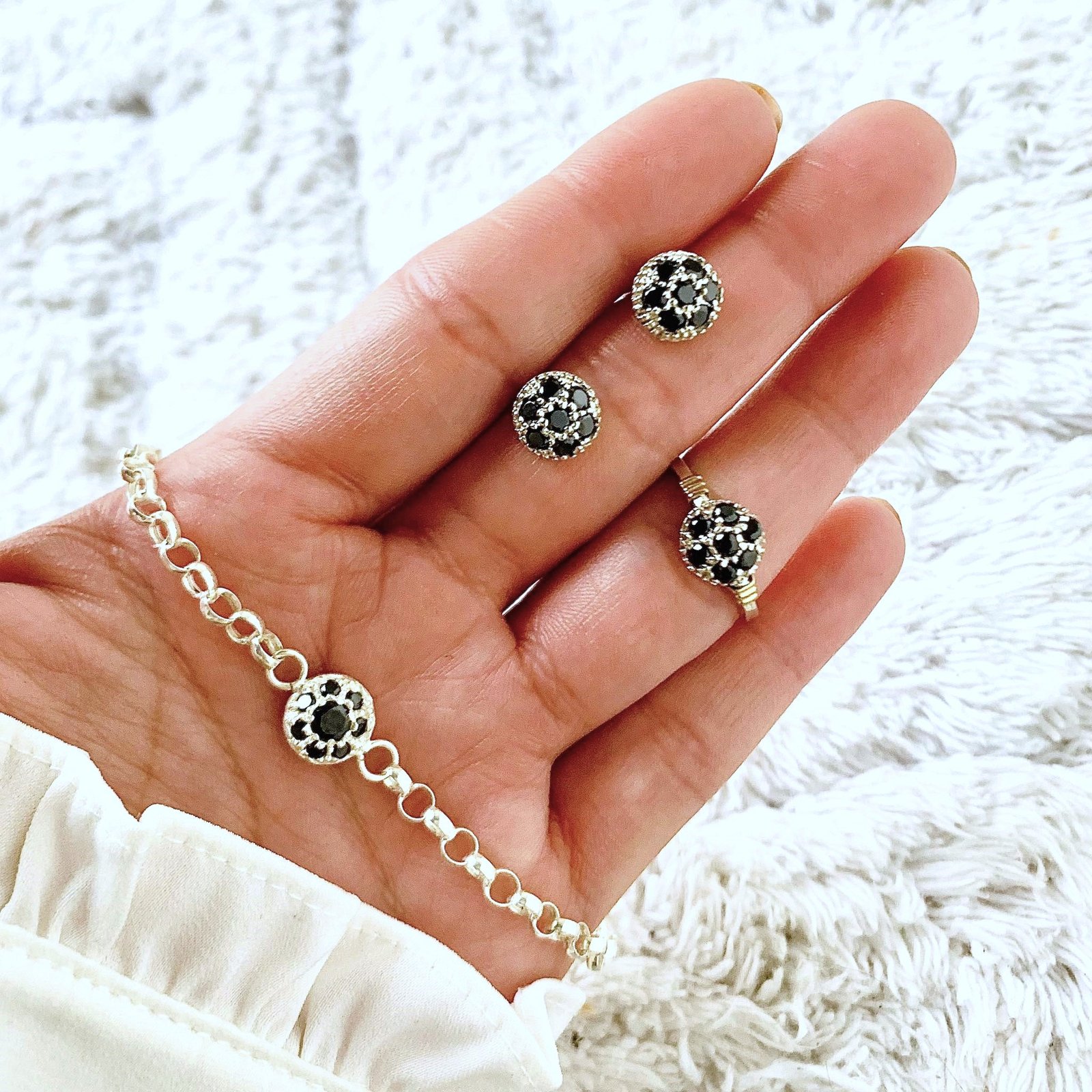 Conjunto Frutillita Aros pulsera Rolo anillo con cubic Negro de Plata y Oro
