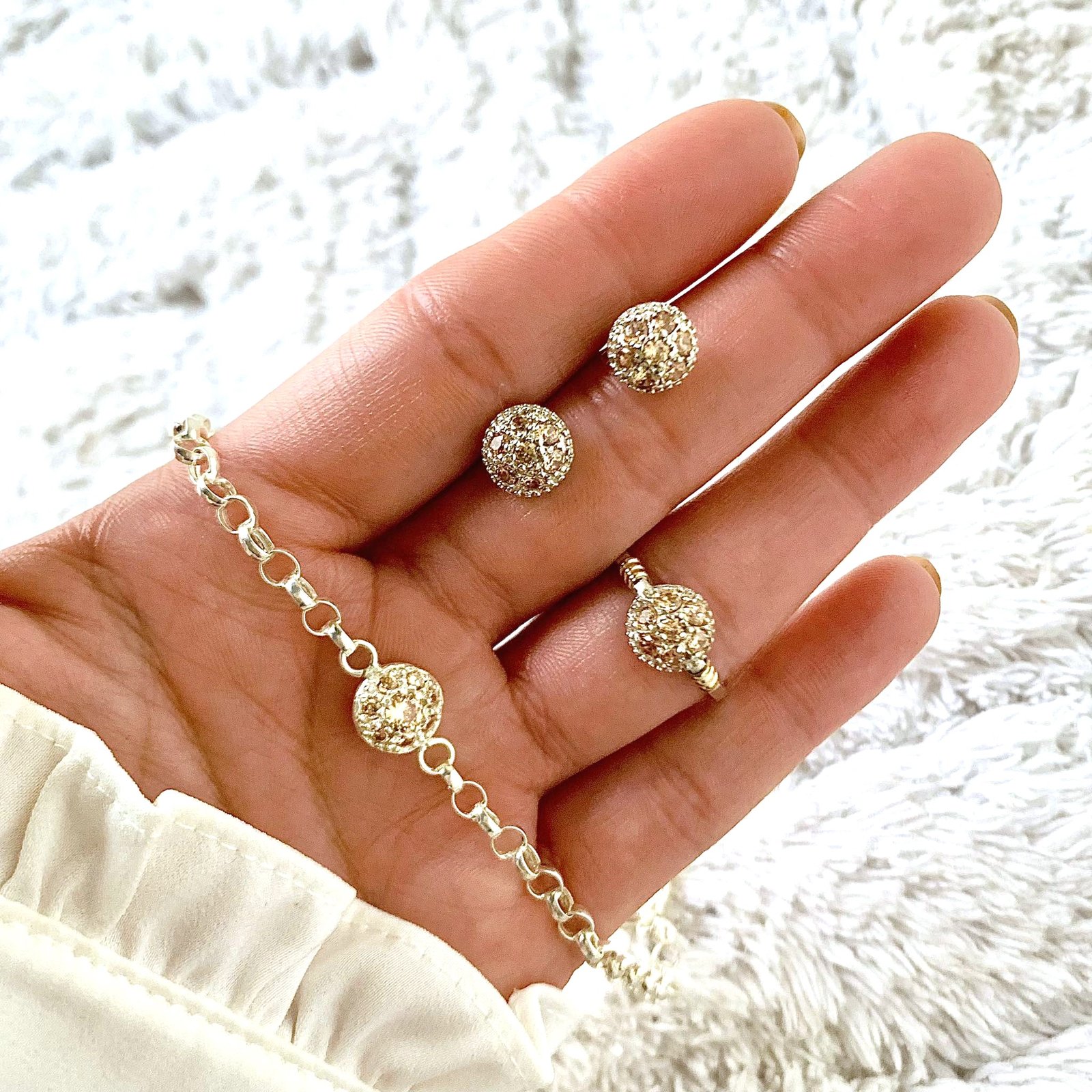 Conjunto Frutillita Aros pulsera Rolo anillo con cubic Ambar de Plata y Oro