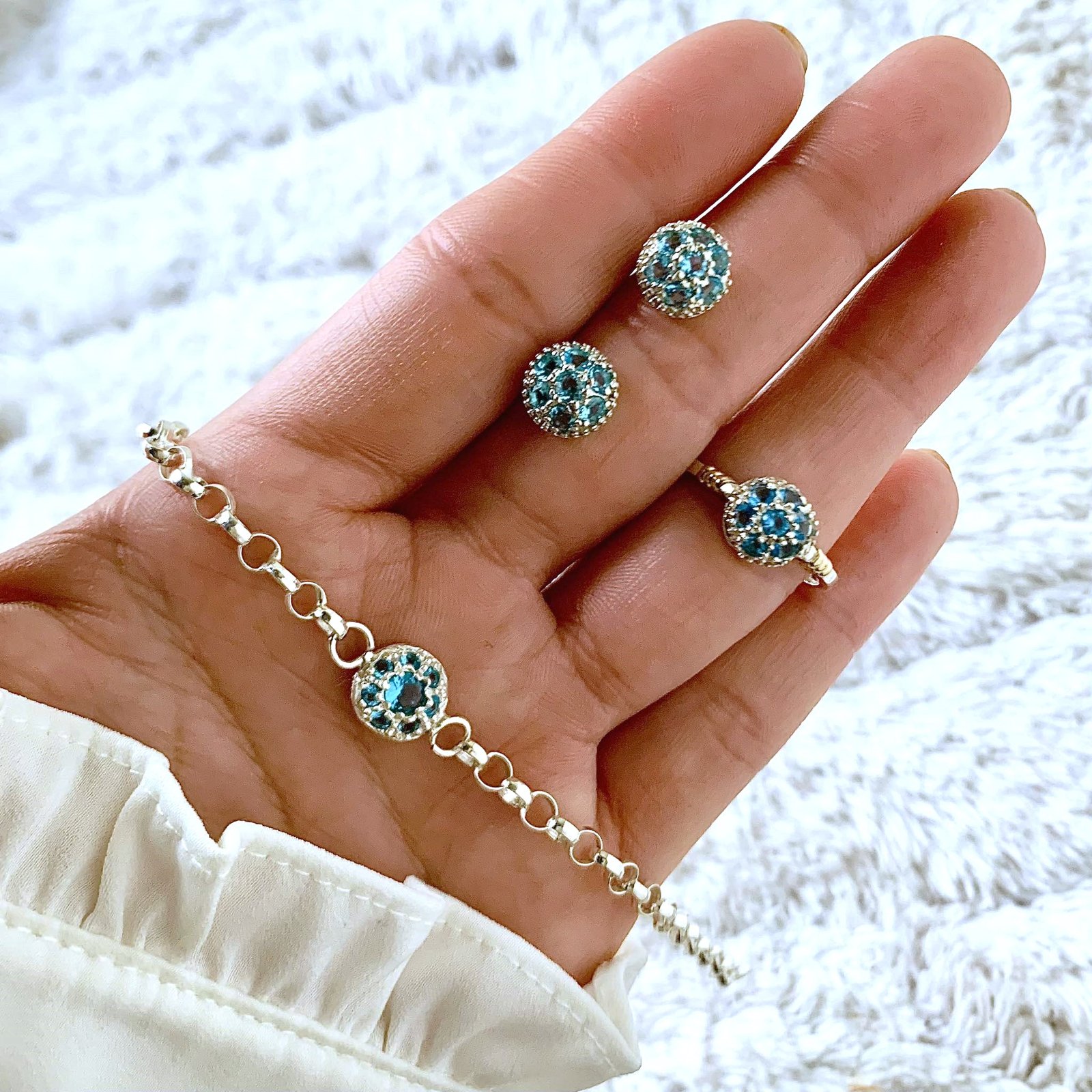 Conjunto Frutillita Aros pulsera Rolo anillo con cubic Aguamarina de Plata y Oro