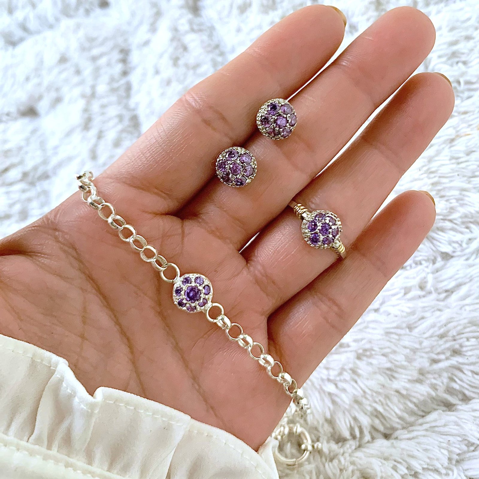 Conjunto Frutillita Aros pulsera Rolo anillo con cubic Violeta de Plata y Oro