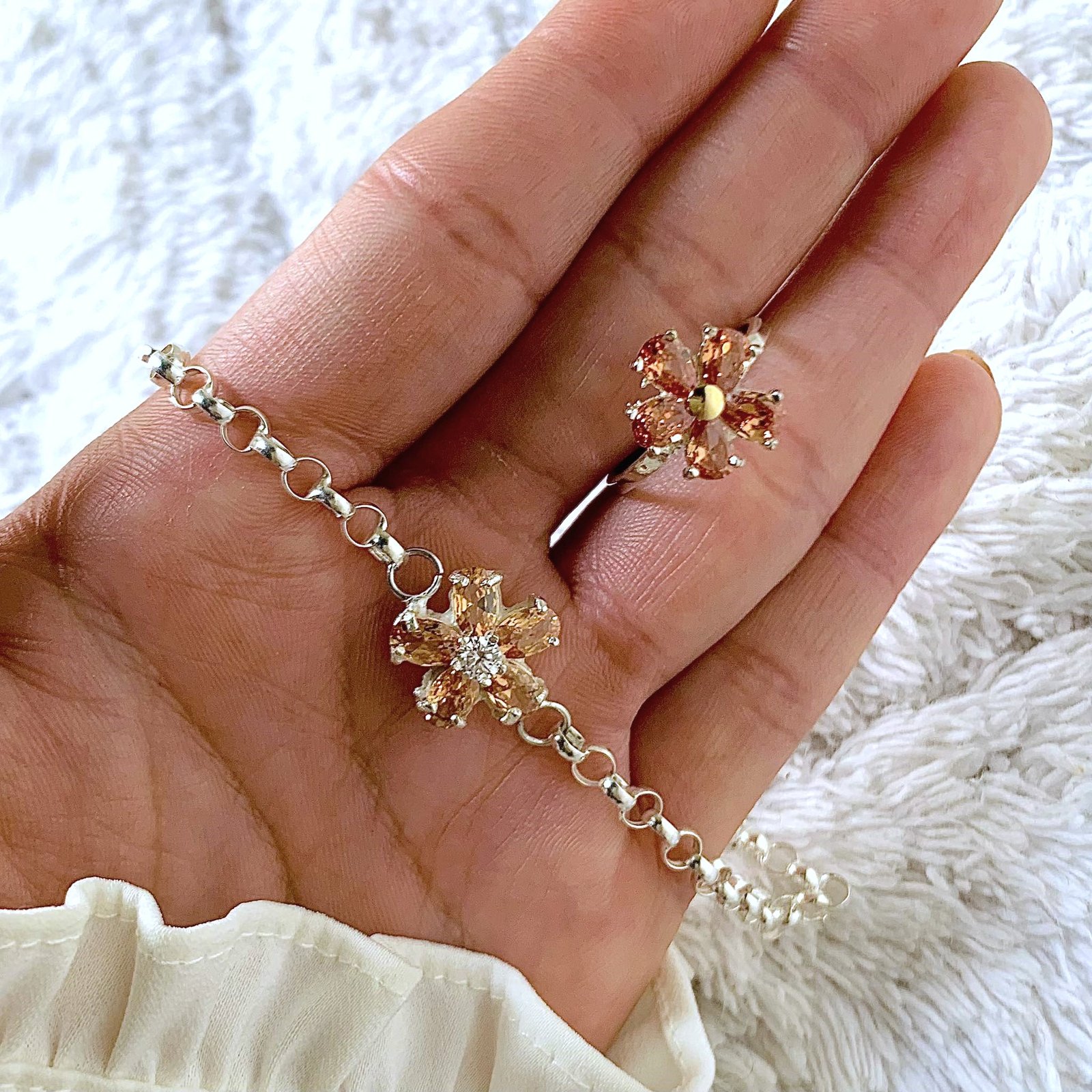 Conjunto Pulsera Rolo y anillo Flor Margarita Ambar de Plata y Oro