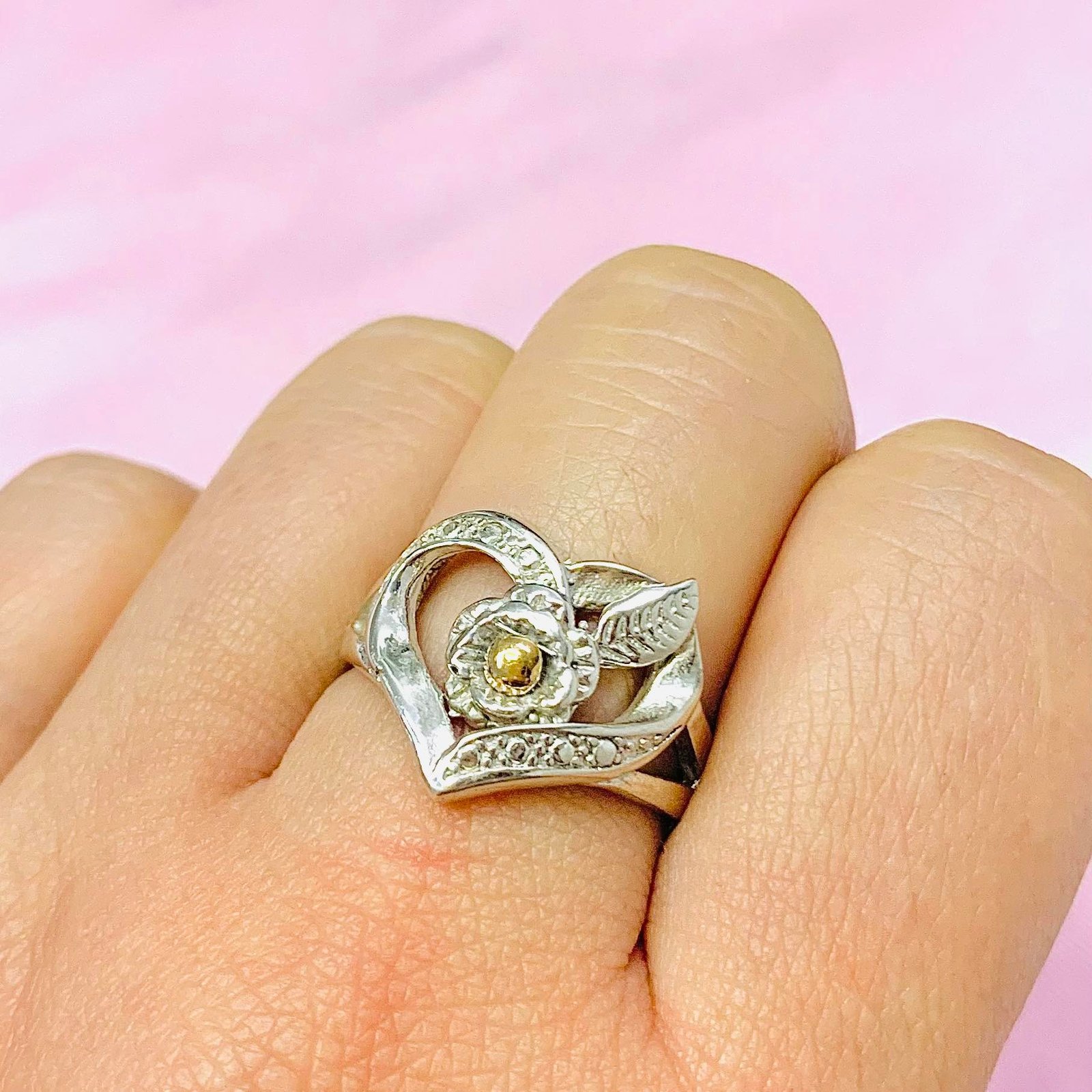 Anillo corazon con flor en el centro Plata y Oro