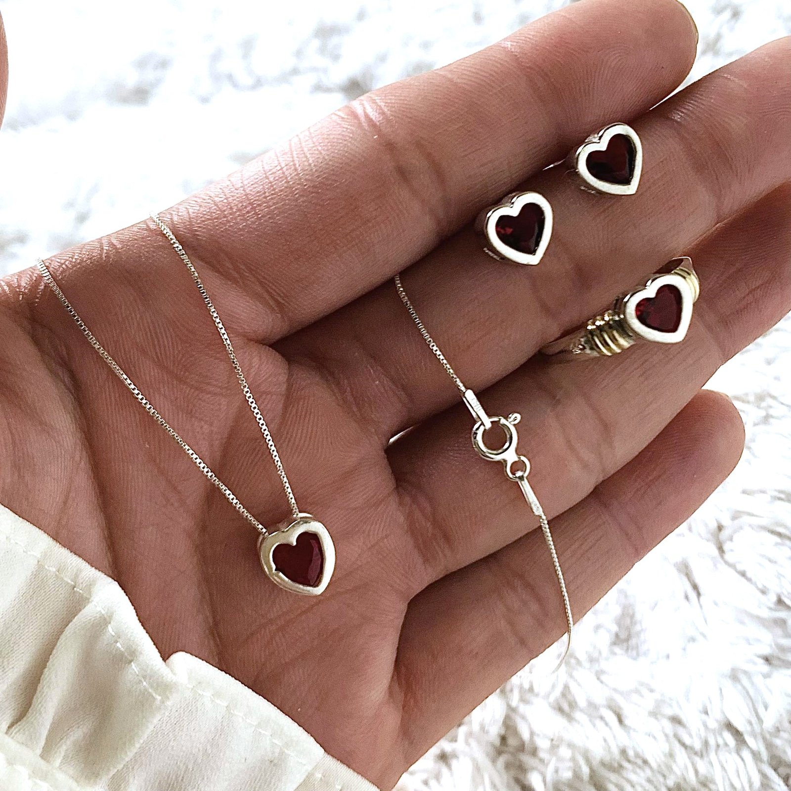 Conjunto cadena veneziana con dije aros anillo susanita corazon Rojo de Plata 925