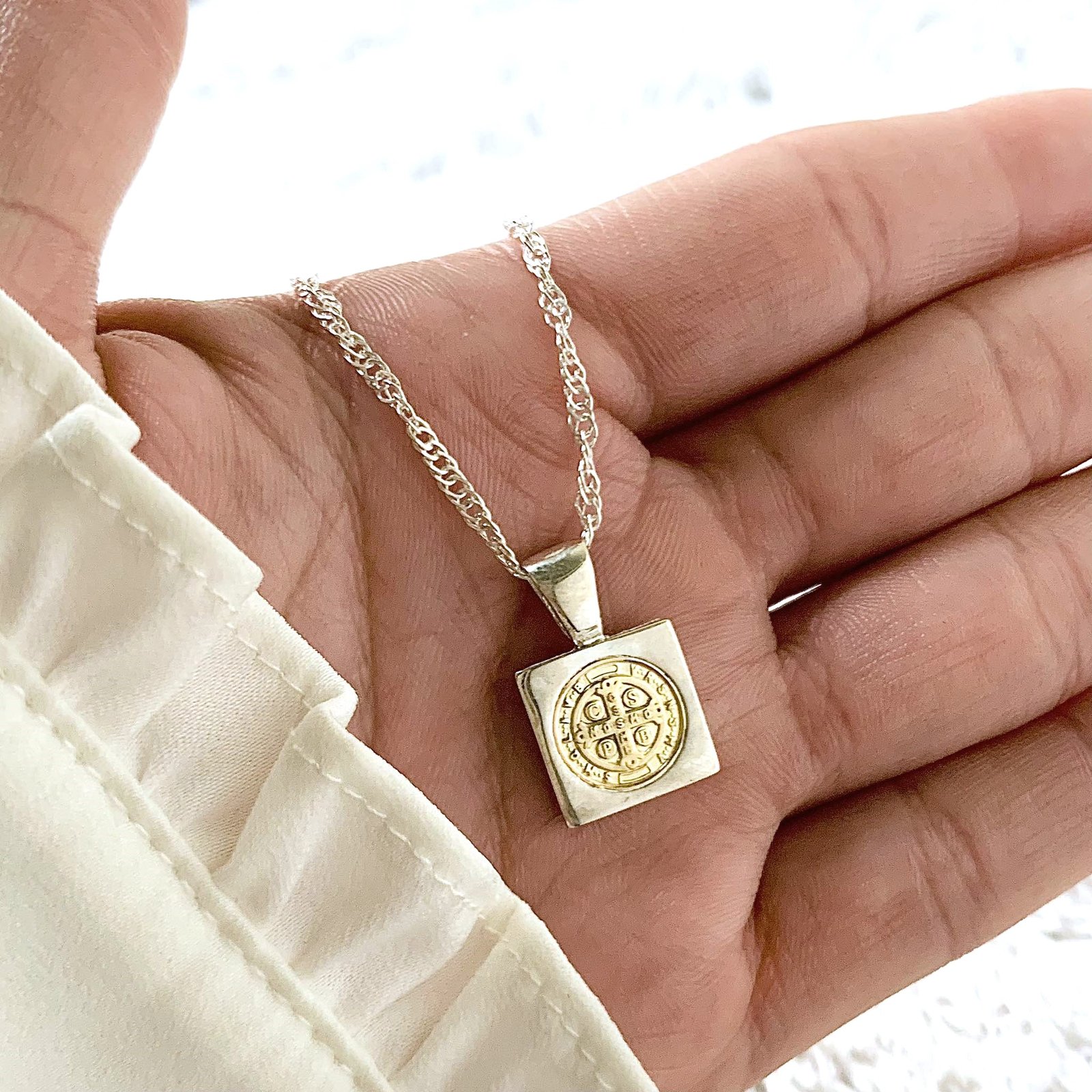 Conjunto cadena singapur 30 con dije San Benito cuadrado de Plata y Oro