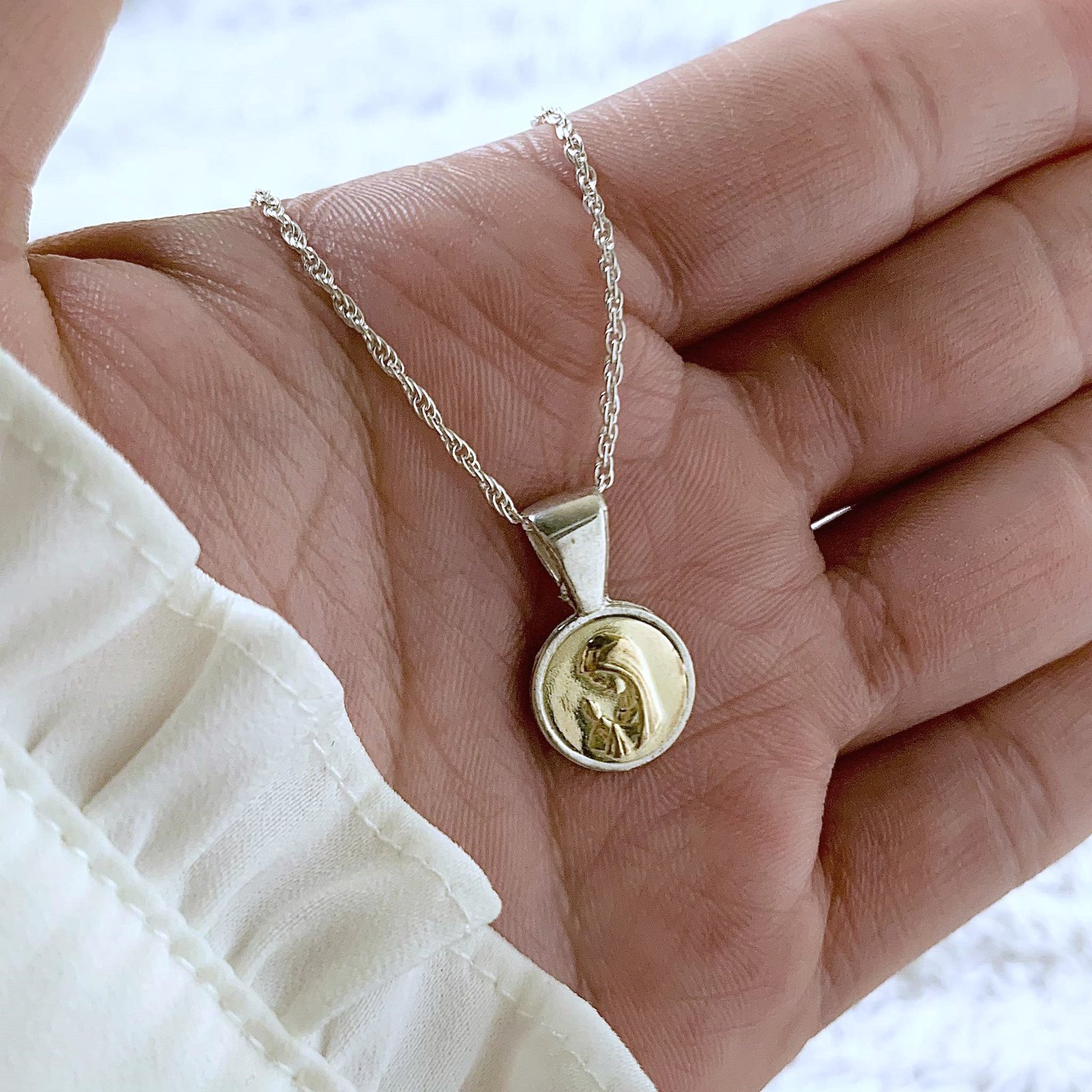Conjunto tourbillon 25 y Dije chico Virgen nena redondo de Plata y Oro