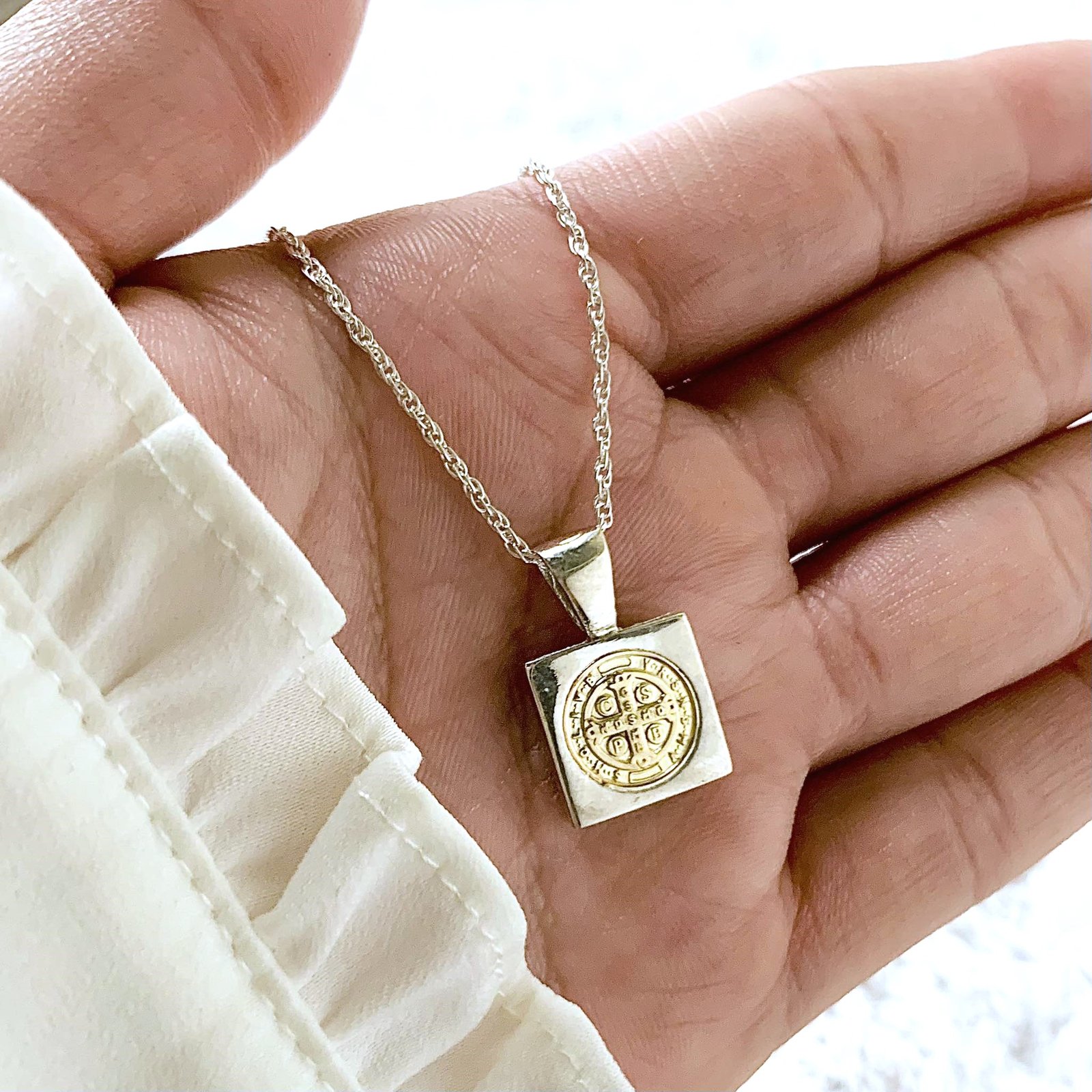 Conjunto tourbillon 25 y Dije chico San Benito cuadrado de Plata y Oro
