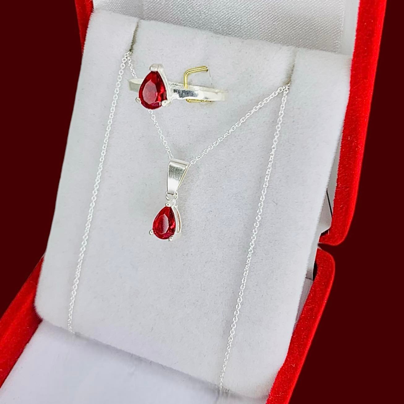Conjunto Rolito Fino dije y anillo gota mediano Rojo de Plata 925