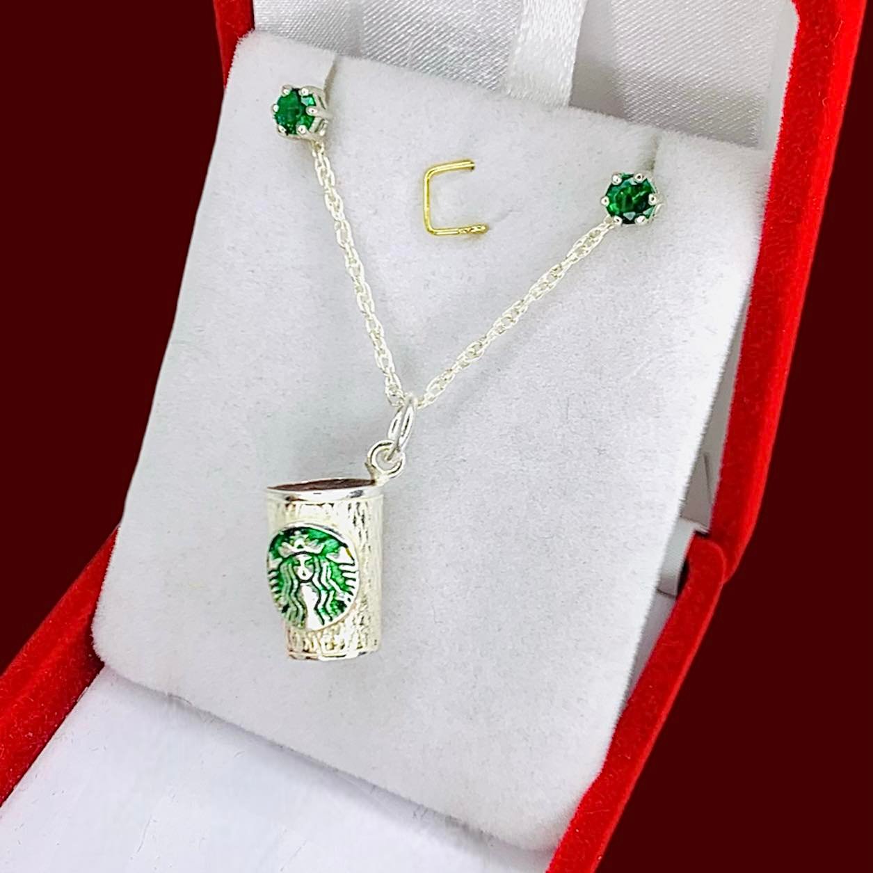 Conjunto Cadena Tourbillon 35 dije Starbucks y aros verdes Plata 925
