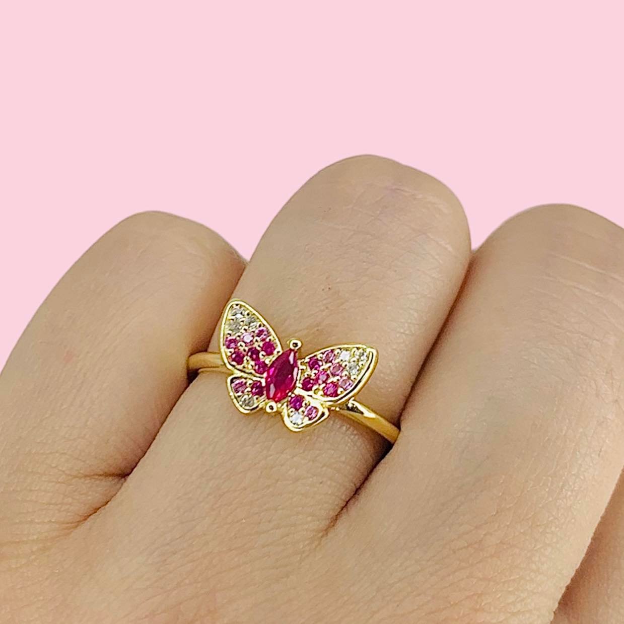 Anillo Mariposa de Jardin Fucsia de Plata y Baño de Oro Gold