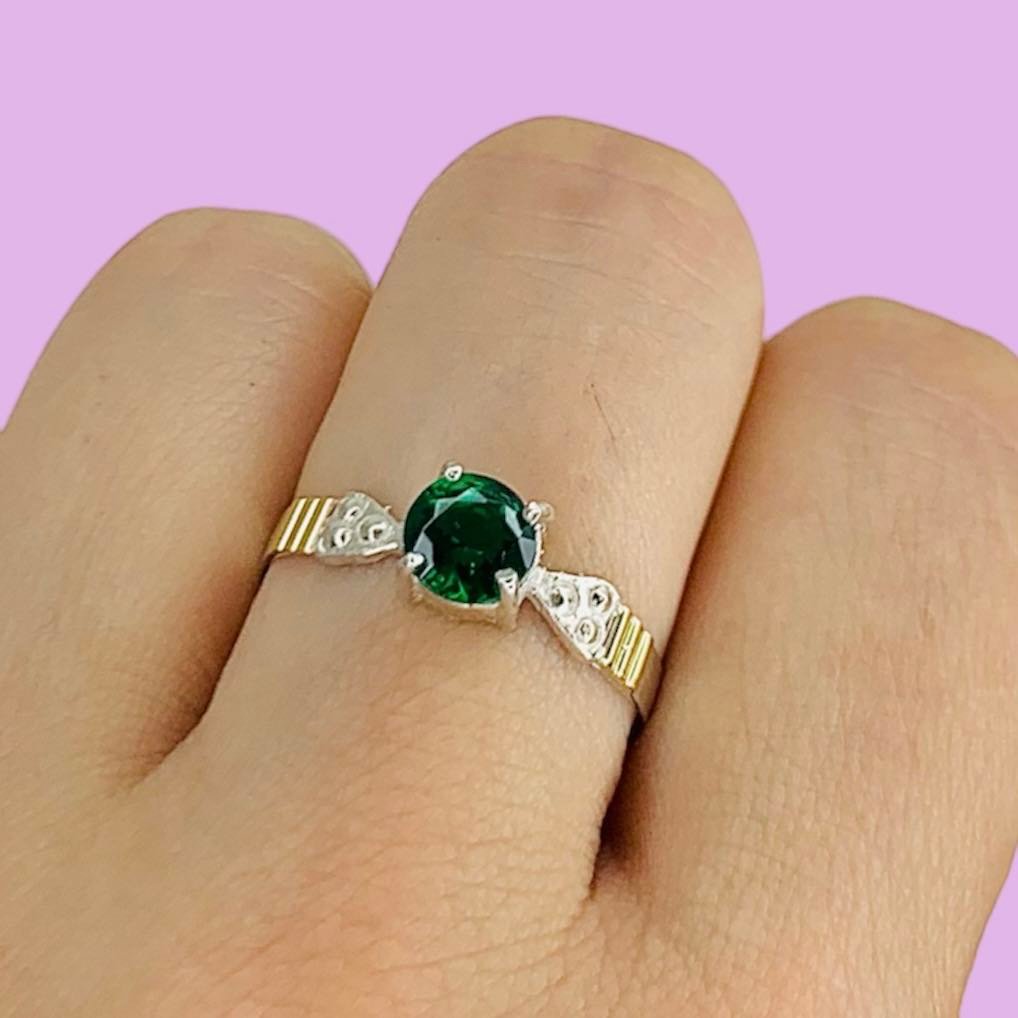 Anillo compromiso con cubic verde con dos flechas de plata y oro