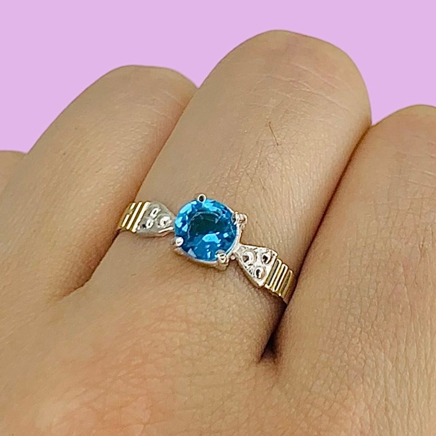 Anillo compromiso con cubic Celeste con dos flechas de plata y oro