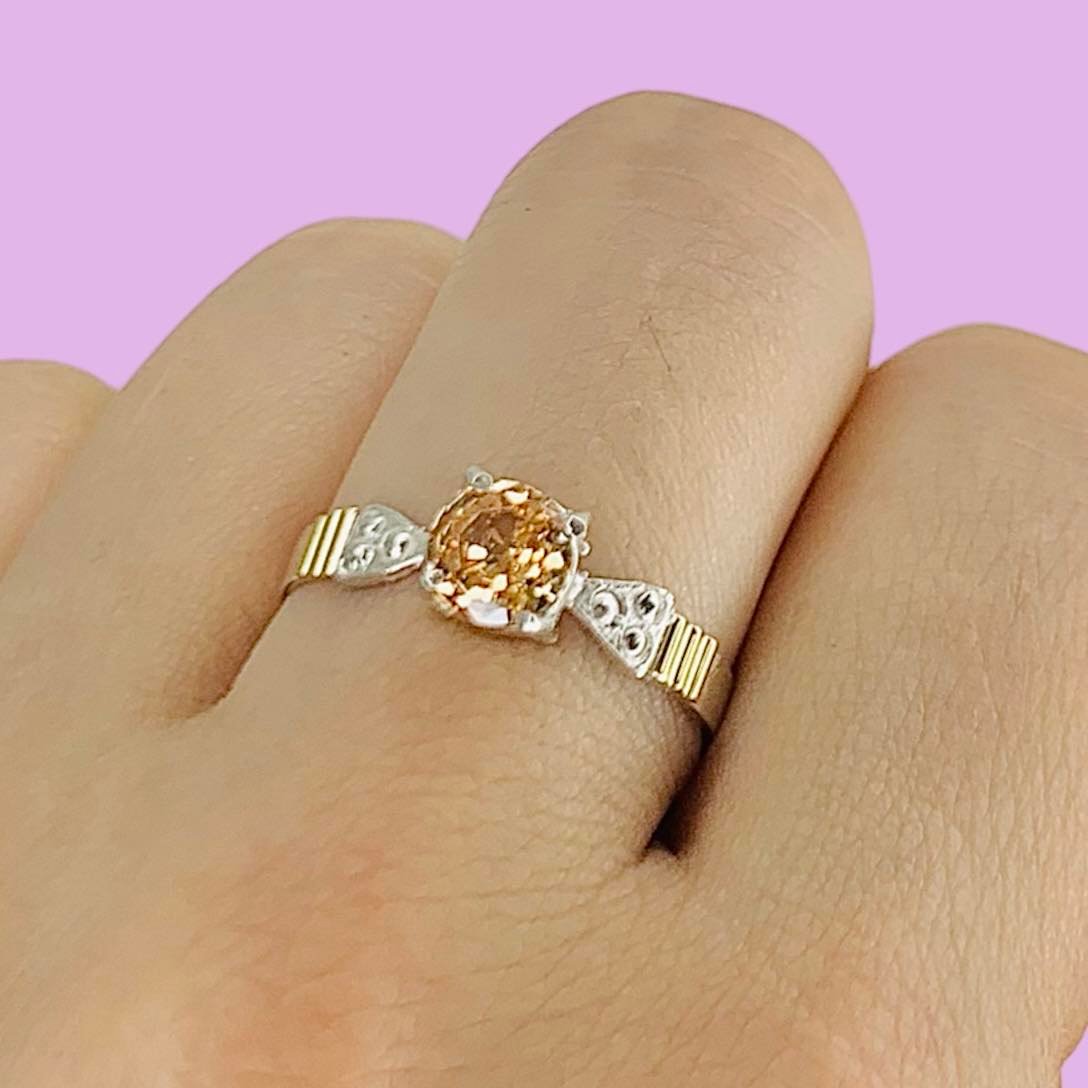 Anillo compromiso con cubic Ambar con dos flechas de plata y oro