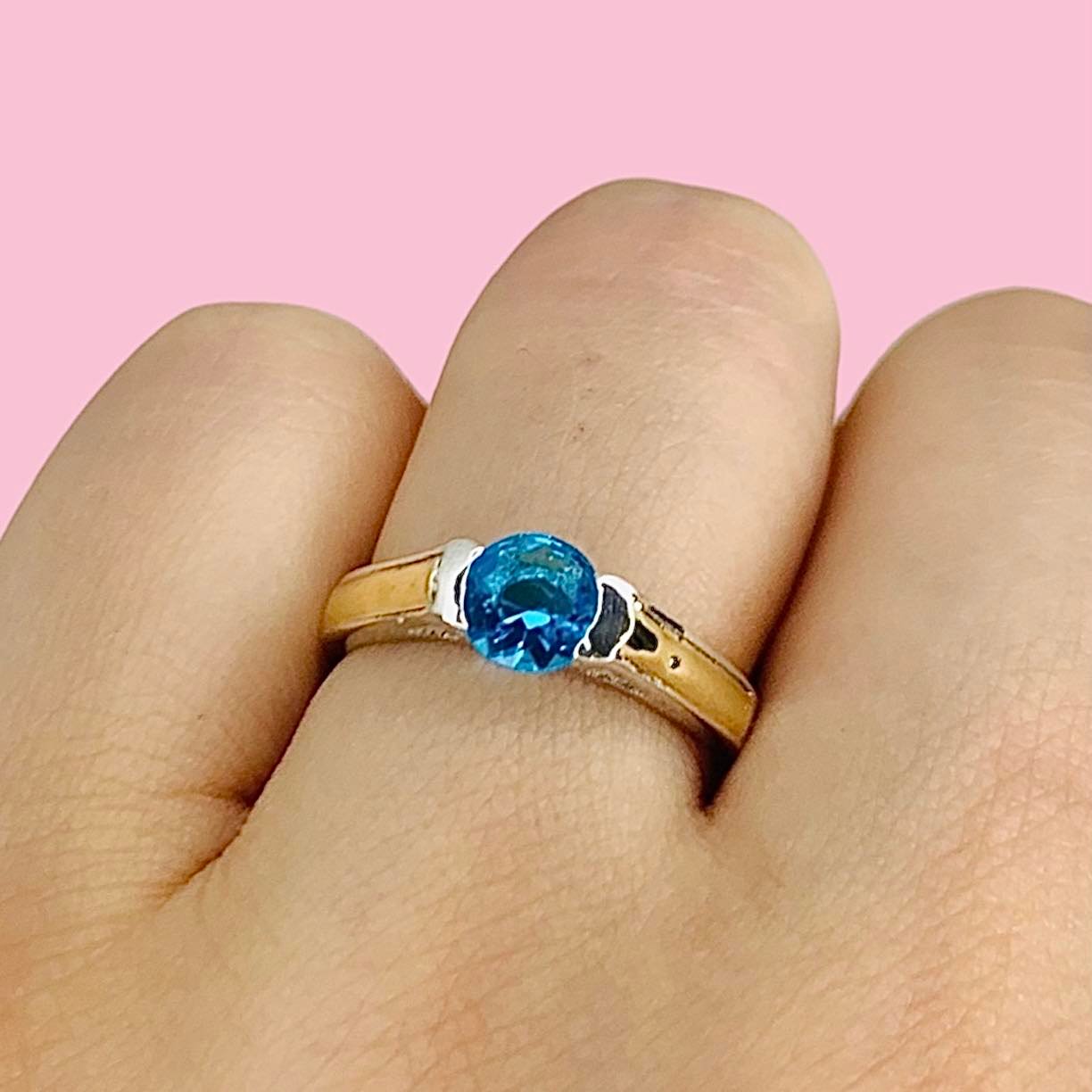Anillo Solitario de Compromiso cubic Celeste de Plata y Oro