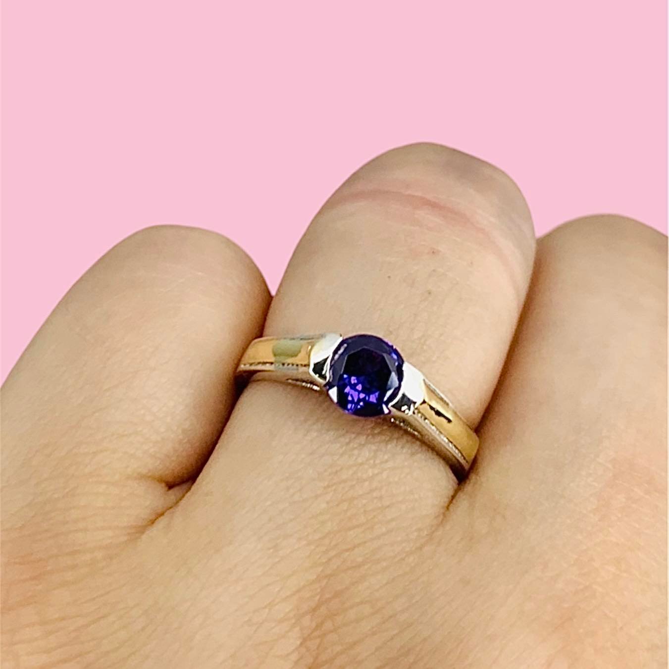 Anillo Solitario de Compromiso cubic Violeta de Plata y Oro