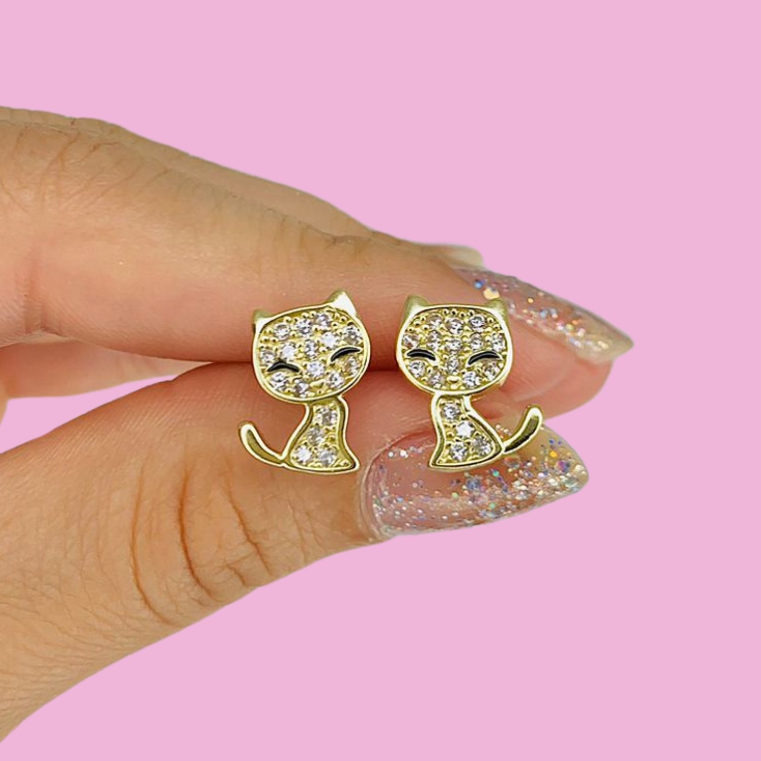 Aros Gatito sonriente con cubic blanco Plata y Baño de Oro