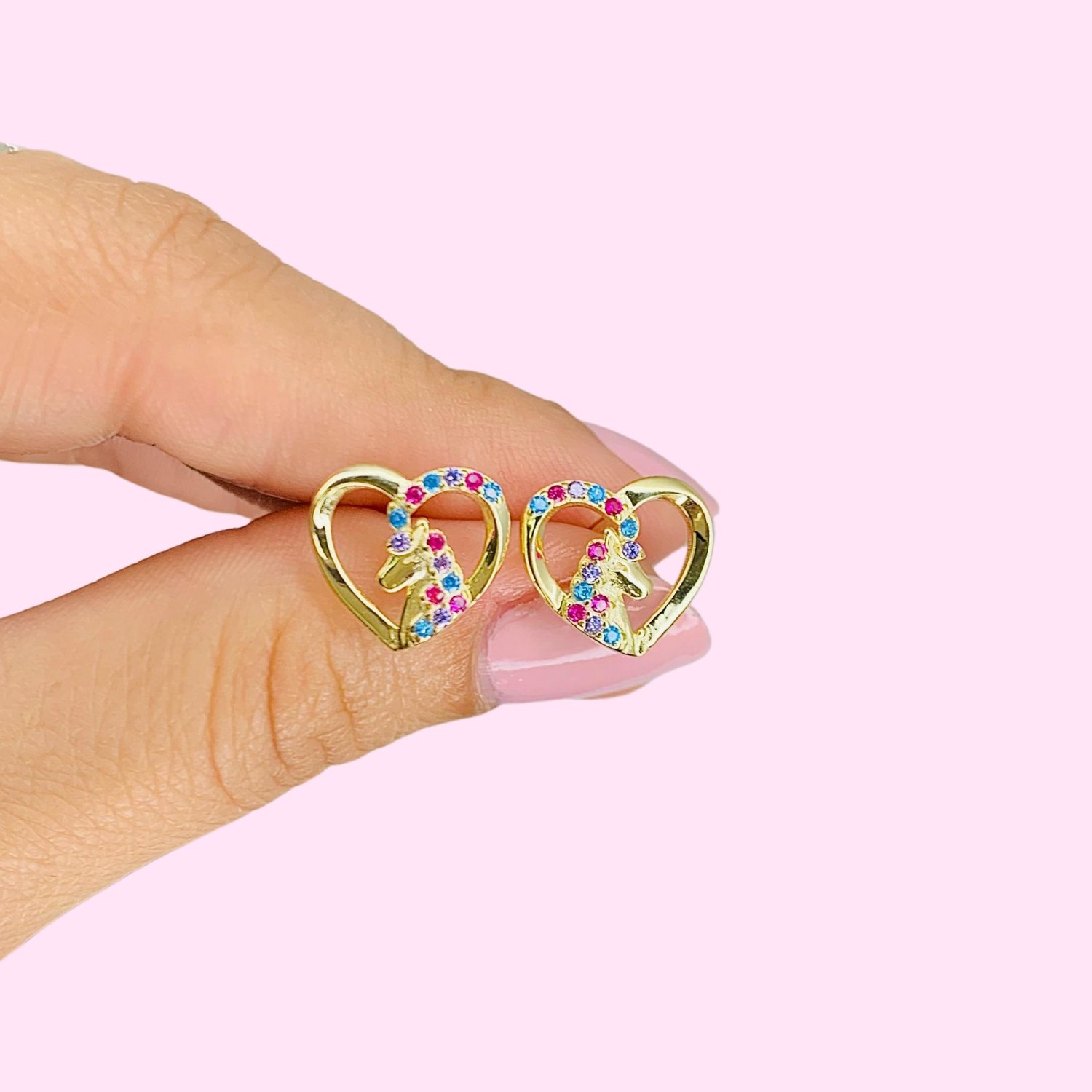 Aros Corazon unicornio con cubic multicolor de Plata y Baño de Oro Gold