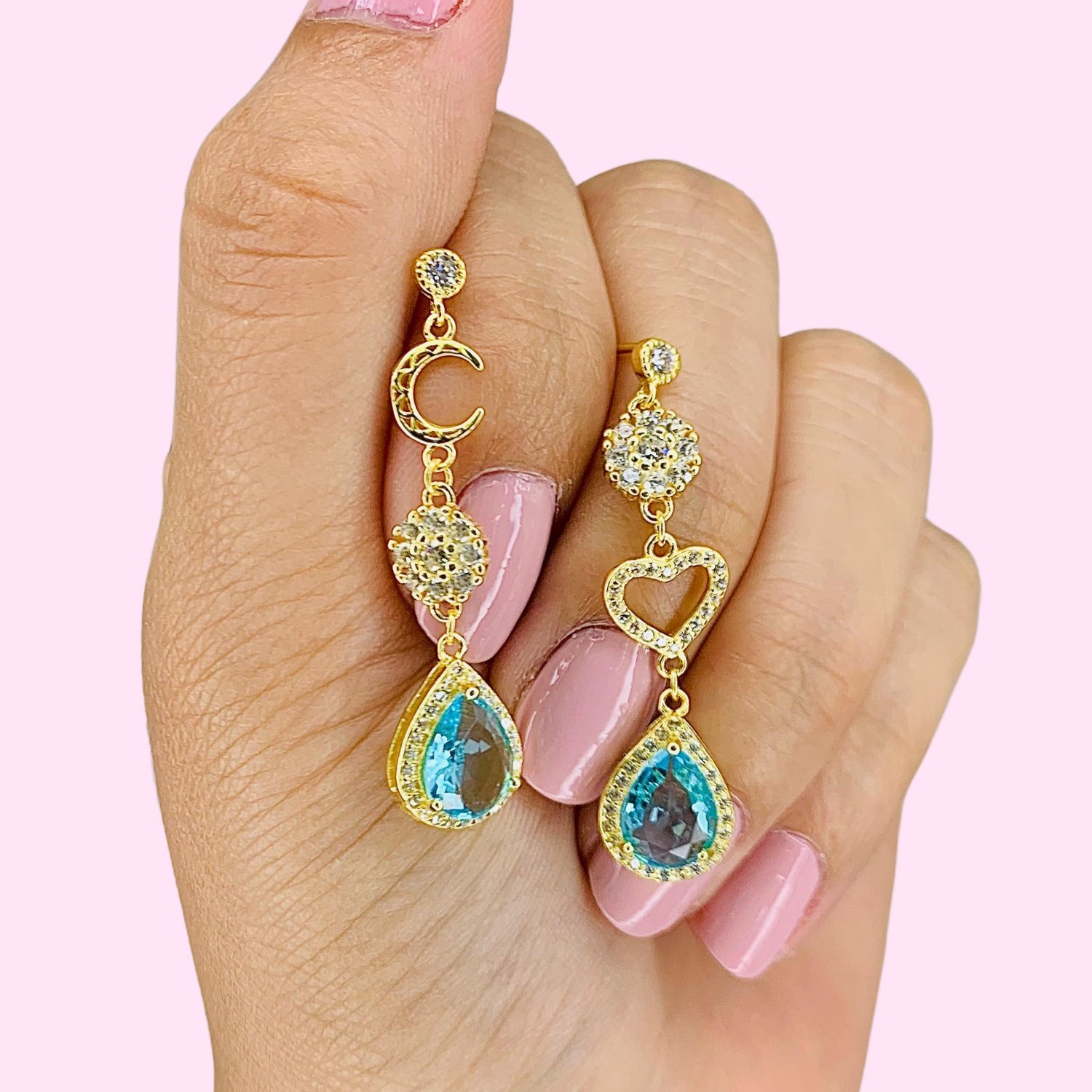 Aros Ensueño corazon y Luna con cubic blanco y celeste de Plata y Baño de Oro Gold