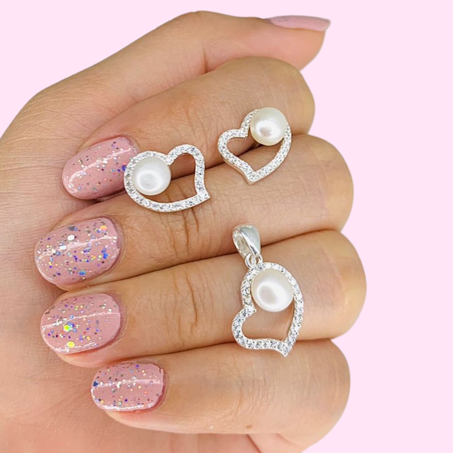 Conjunto Aros y dije Corazon con Perla de Plata 925