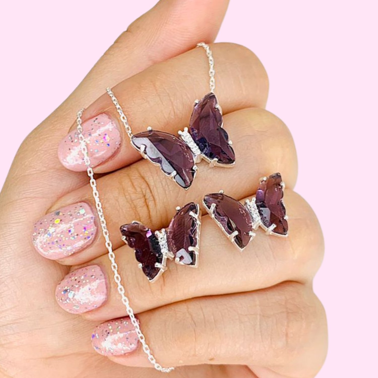 Conjunto gargantilla Espejado Aros y dije Mariposa Violeta de Plata 925