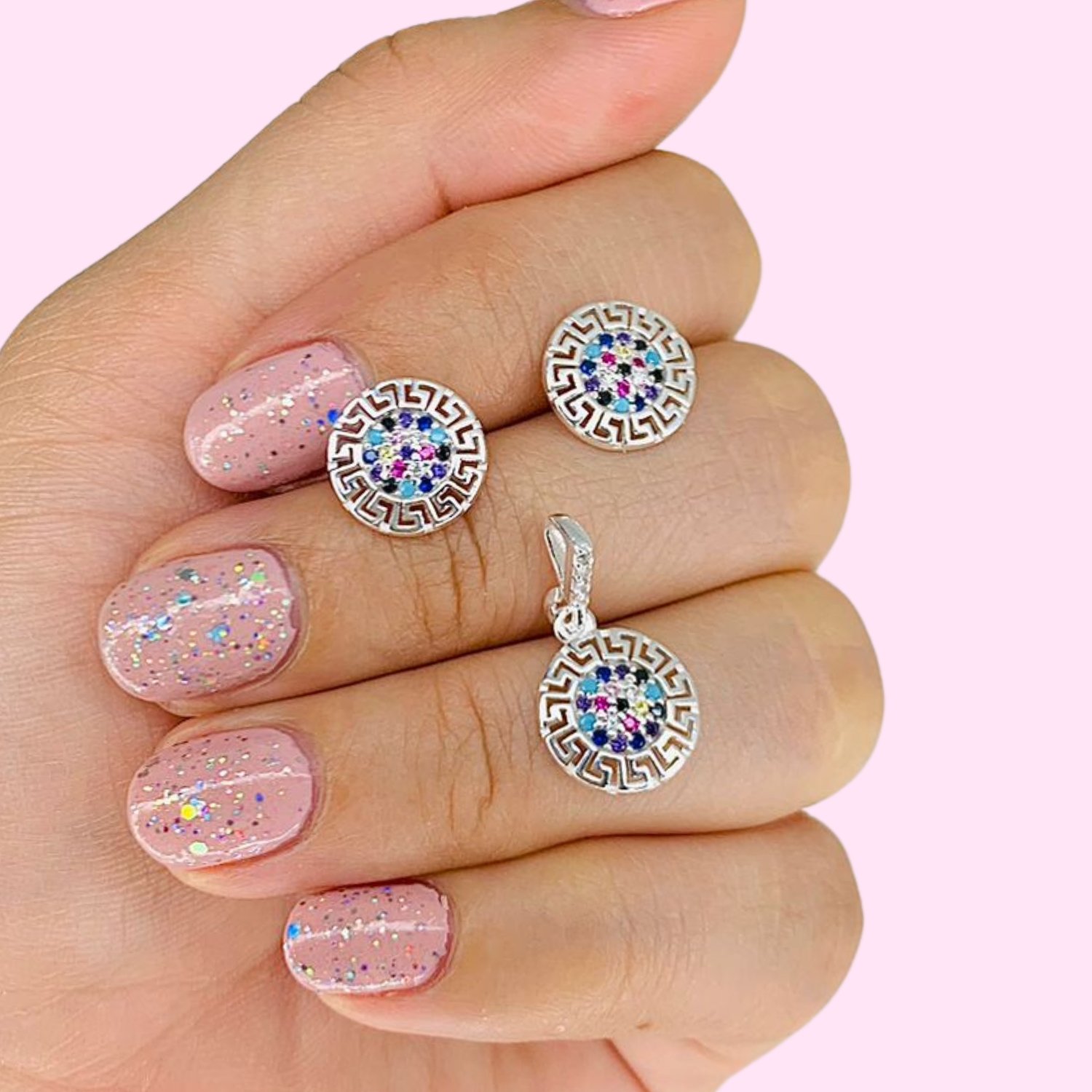 Artículo: KIT 130Conjunto Aros y dije guarda griega redondo cubic multicolor