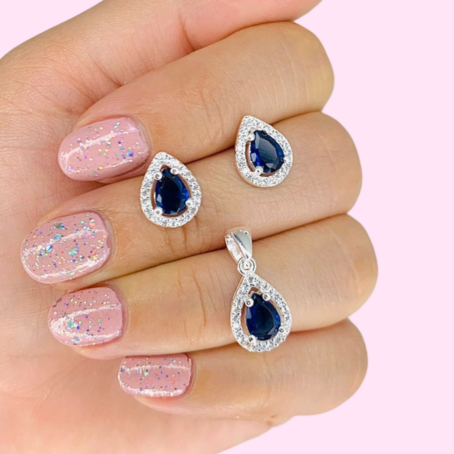 Conjunto Aros y dije Diana cubic gota azul de Plata 925