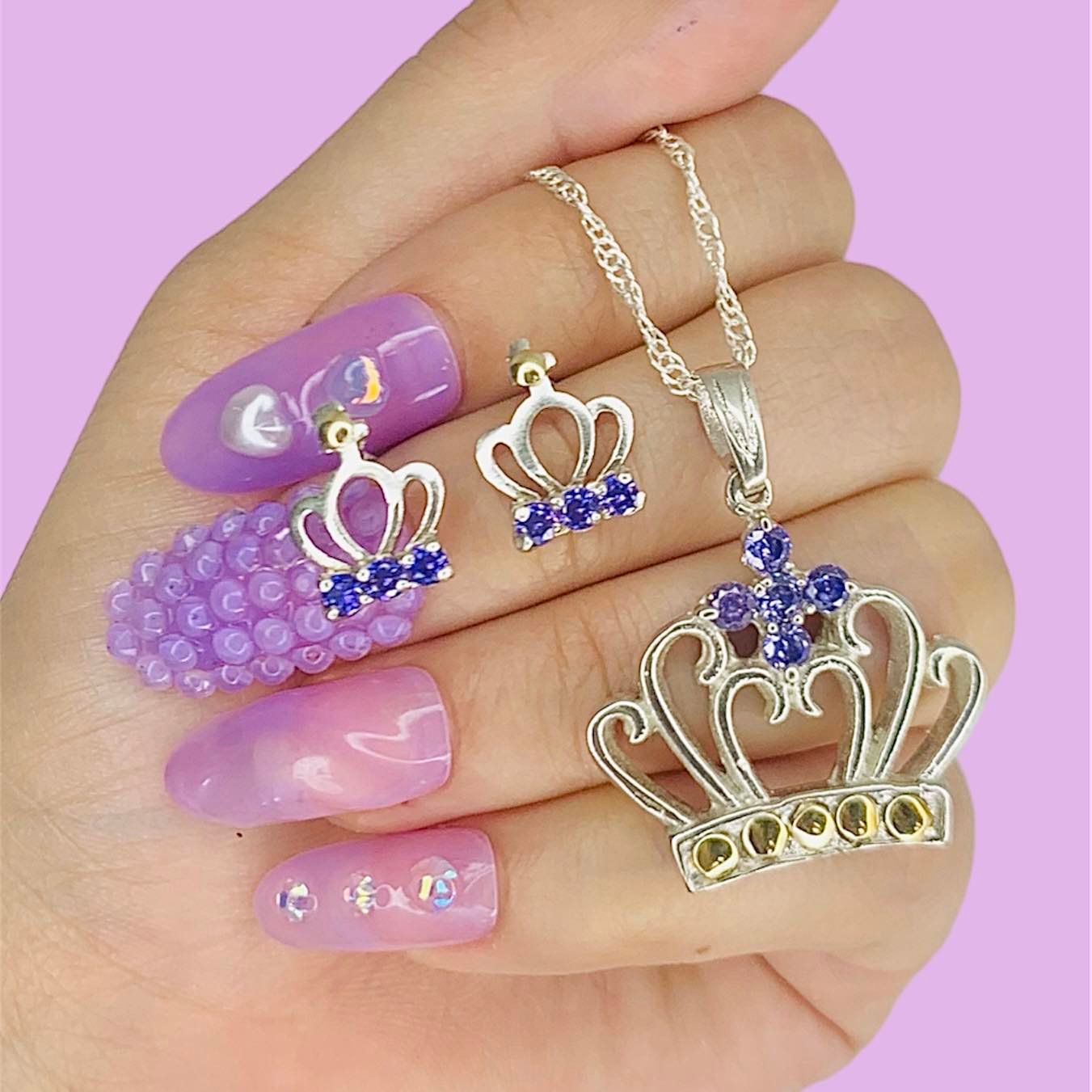 Conjunto Singapur 30 Dije cruz Grande y Anillo Corona cubic Violeta Plata y Oro