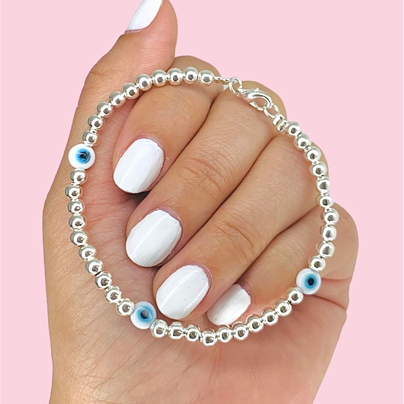 Pulsera Bolitas Plateadas con 3 ojitos protector