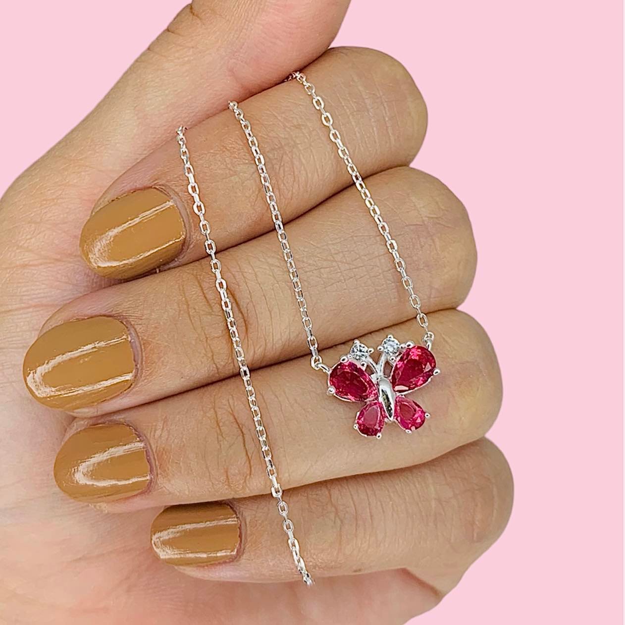 Conjunto Cadena Espejado Mariposa Cubic gota Fucsia de Plata 925