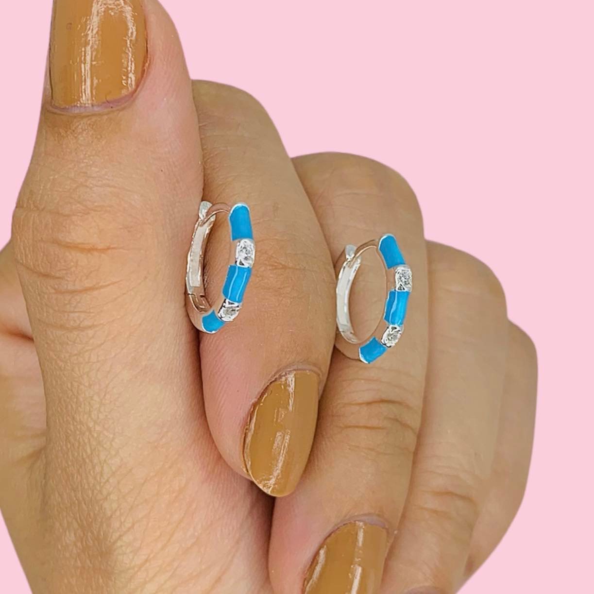 Aros Clip Italiano Esmaltado Celeste con cubic blanco de Plata 925