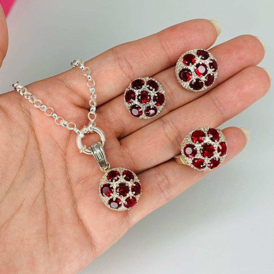 Conjunto Cadena Rolo n.0000 Aros Anillo y Dije Frutillon de Plata 925