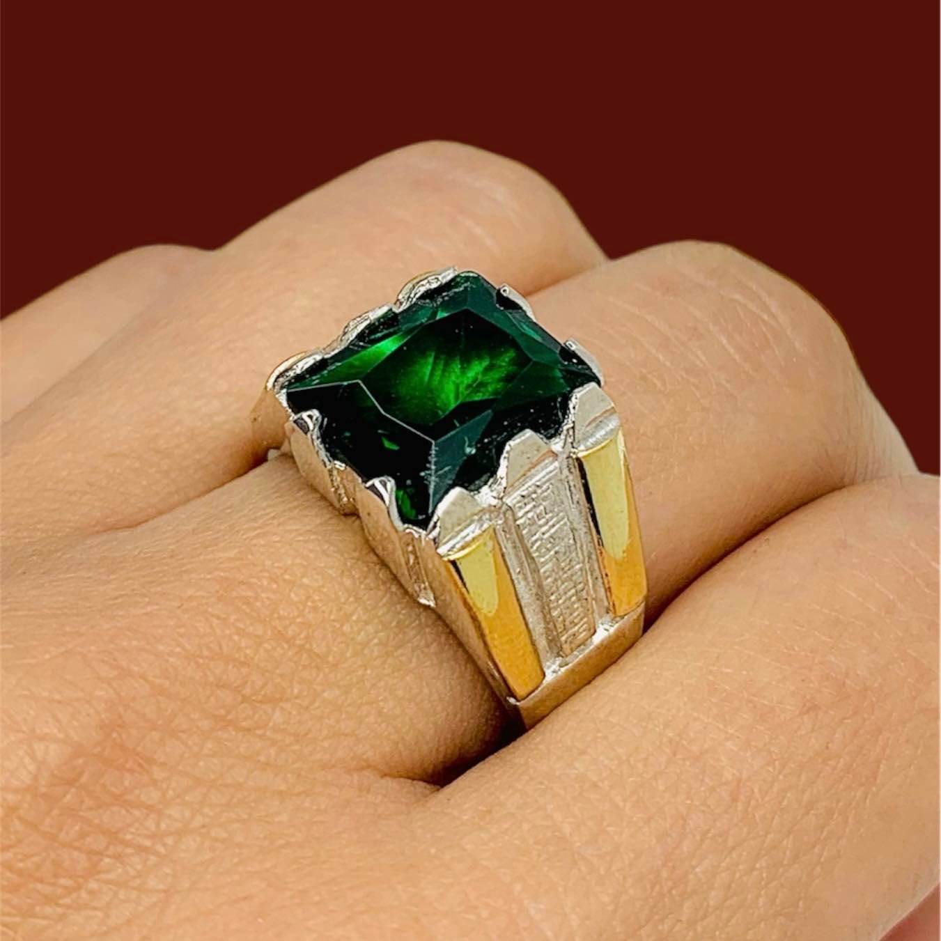 Anillo Leo Sello Grande para Hombre con cubic rectangular Verde Plata y Oro