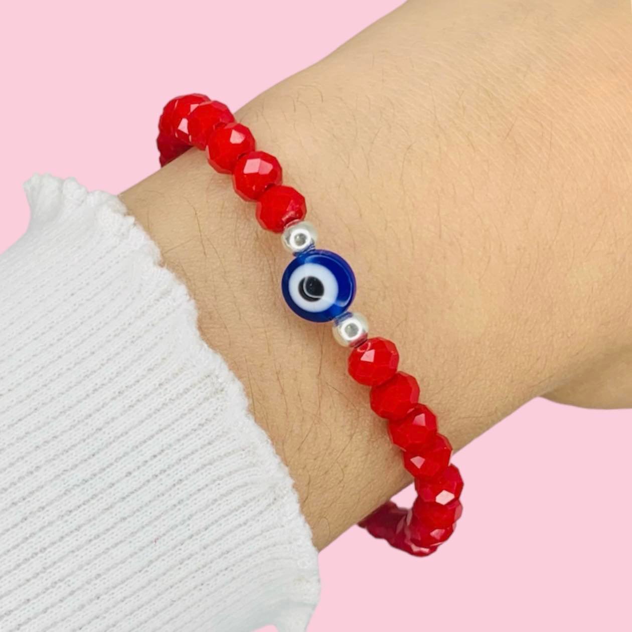 Pulsera Cristal Rojo Ojito protector con bolitas plateadas
