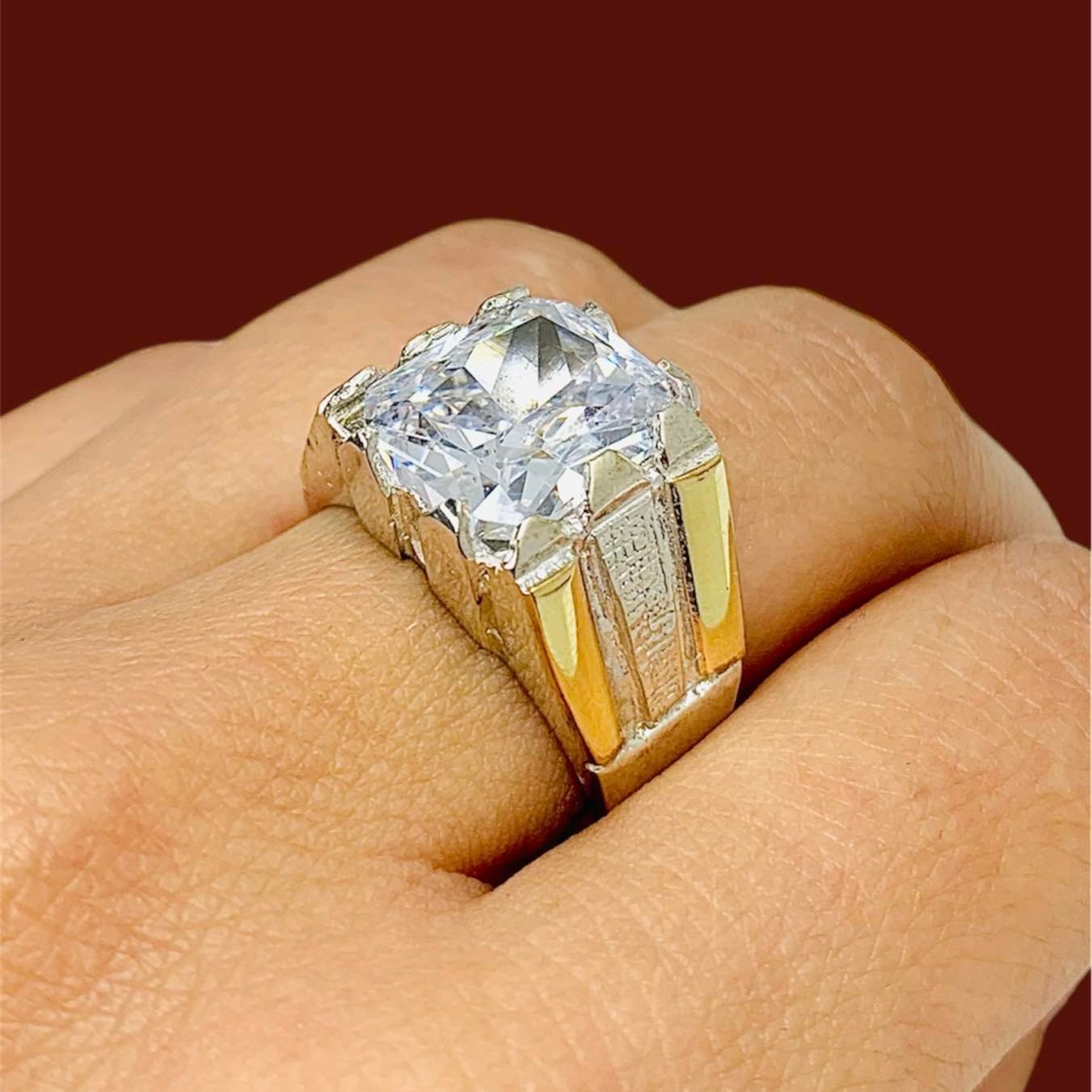 Anillo Leo Sello Grande para Hombre con cubic rectangular Blanco Plata y Oro